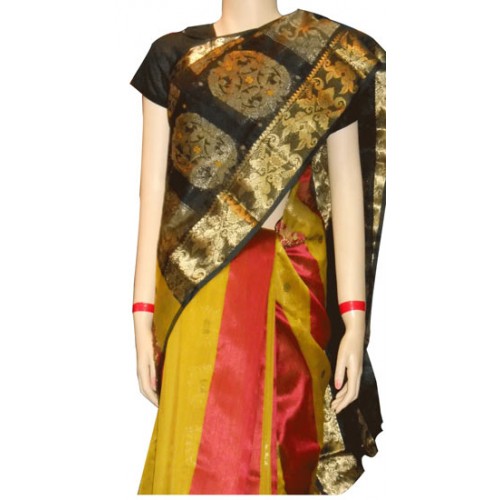 One can look ethnic best with this gorgeous Tangail Half silk sharee in shades of black,yellow,red and golden colour.Colour gurantee 100%.