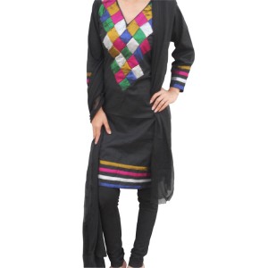 Anyone can make up her feminine poise with this bright Churidar Suit and Kameez. The black is so full of life and the colourful print create a excellent effect.The salwar kameez and the churidar pants are all made from pure arong cotton with glitter aplic. Orna can be tath or shiffon with stone and laise design.