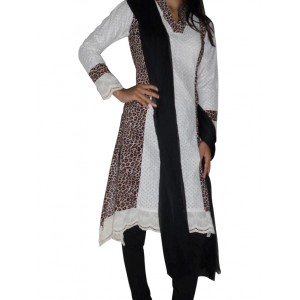 Linen animal printed and chicken fabric kamiz with laise. Pure Silk Seloyar decorated shiffon orna.